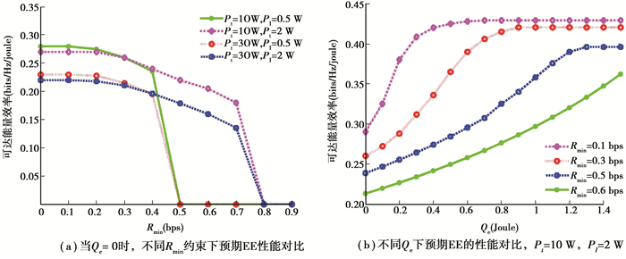 图 2说明了该算法的收敛速度。显而易见的是,该算法收敛速度快但对初值不敏感,且符合Dinkelbach方法的收敛性判据[13]。图 3(a)说明了在不同主用户网络不同Pt、PI和最低吞吐量Rmin设置值约束条件下的能量效率性能比较。可清楚看到,当Rmin最小时,能量效率达到最大。这意味着在优化能量效率的过程中,次用户发射机总是尽量少发送数据以便节省能量。当Rmin增加时,能量效率将会降低。尽管Rmin作为约束条件增加了,但将会导致吞吐量和能耗量同时提高,且能耗量的提高将大于吞吐量的提高,所以仍然会导致能量效率在总体趋势下的降低。此外,PT相同但PI不同时,能源效率相同。尽管因PI增大会导致传输功率P的范围增大,但系统一旦达到Rmin,传输功率P将不再增加。另外,能源效率将会随PT增加而降低。这是因为若PT越大,对次用户接收机的干扰越大,传输时间τ会延长因此Rmin吞吐量会降低,则传输功率P会提高直至达到Rmin吞吐量要求,致使次用户发射机消耗更多能量。最后,当次用户网络干扰强度足够大并且PI较大或足够大时(达到一定门限时),次用户发射机ST可能无法满足任何约束条件,RF EH-CRN能量效率最大化的优化问题将无法求解,则能量效率有可能会大幅降低或直接降至0左右,系统能量效率将会受到大幅度影响。从图 3(a)同时也能看出,当Pt较小为10 W时,系统能效消失的Rmin门限更高,约为0.7,而当Pt更大时,门限约为0.4,这也与之前能效降至零的说法一致。图 3(b)分析了在不同初始能量值Qe约束条件下的能源效率性能对比。首先,当Qe=0时,次用户发射机ST完全依赖能量采集以满足最低吞吐量约束Rmin,能量效率随Rmin的增加而增加,该结果与图 3(a)中的分析结果一致。可以看到,能量效率随剩余能量Qe的增加而提高。其原因在于,当Qe增加时,需要耗费在采集能量阶段的时间更少,而同一时隙分配给传输数据的时间则会增加,从而可有效降低传输功率和总耗能。最后,当Qe继续增加并能满足Rmin约束需求,次用户发射机无需对采集能量进行时间分配而直接进行数据传输,能量效率将不再发生变化。