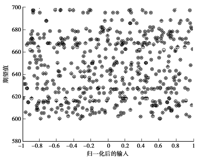 结果显示其误差在1以内,如图 6所示,x轴为归一化的输入,y轴为期望值,设定为600-700之间的随机数。*为期望的输出值(焦点位置),O为仿真结果(神经网络的输出)。从图中可以发现,*和O重合度较好。