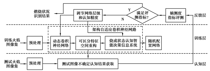 2) 认知层基于训练层提供的构建标准,获取特定网络层级和认知精度条件下测试火焰图像燃烧状况的不确定认知结果,为反馈层的熵测度指标提供启发式反馈信息。