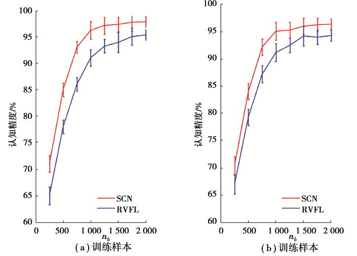 图 4 关于不同nb的SCN与RVFL认知精度比较(a)训练样本(b)测试样本 Fig. 4 Comparison of cognitive accuracy between SCNs and RVFLs with different nb (a)Training dataset(b)Testing dataset |