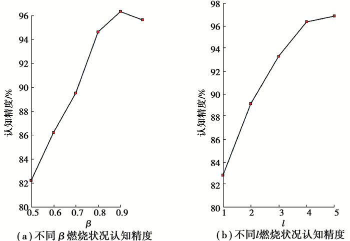 图 5 燃烧状况认知精度和不同的β和l Fig. 5 Burning state cognitive accuracy vs. different β and l |