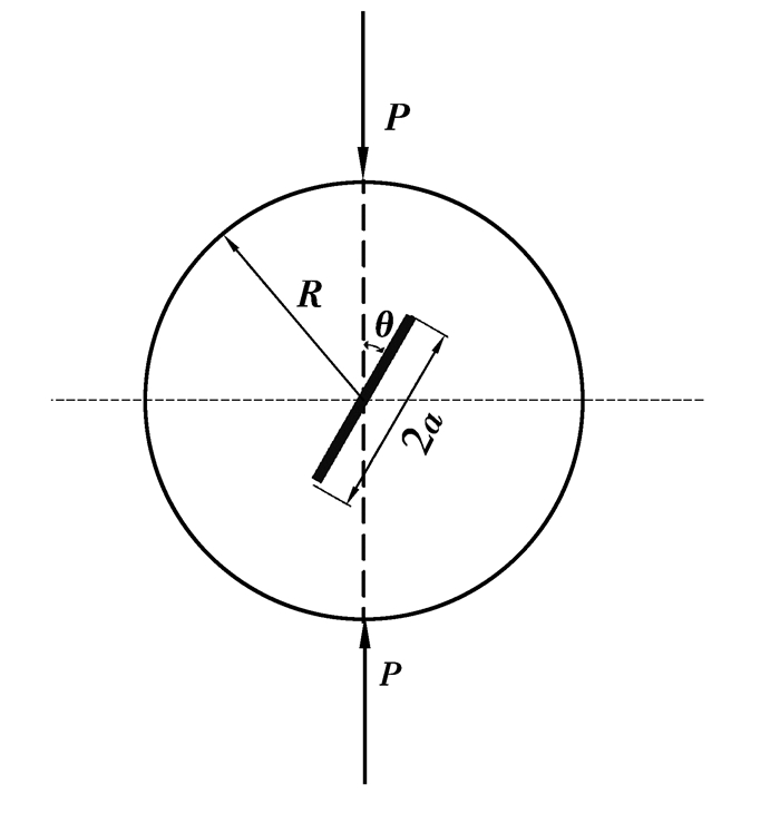 2 方法验证采用巴西圆盘实验法(cracked straight through Brazilian disc,CSTBD)测试页岩剪切滑移型岩石断裂韧性[45-46],裂缝与加载方向夹角为θ= 30°,试件尺寸如图 3所示,其断裂韧性计算公式为