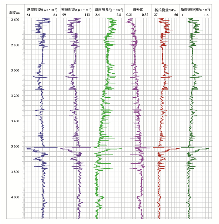 2) 结合密度测井、声波时差测井数据,参考某页岩水平井测井解释成果,获取了基于页岩剪切滑移型断裂韧性指数的井筒连续性剖面,为页岩工程可压性评价提供基础数据。