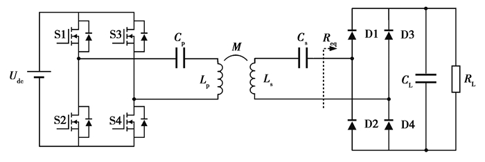1 S/S型磁耦合WPT系统S/S(series/series)型MC-WPT系统拓扑如图 1所示。系统主要分为能量发射端和拾取端2部分。在能量发射端,直流电压源Udc提供整个系统的电能输入,MOSFET S1-S4构成高频逆变电路,发射线圈LP和补偿电容Cp串联构成了发射端串联谐振回路。在能量拾取端,接收线圈Ls和补偿电容Cs串联构成拾取端谐振回路,二极管D1-D4和滤波电容4CL构成整流滤波电路,将拾取端接收到的交流电能转换为直流电传递给负载RL。