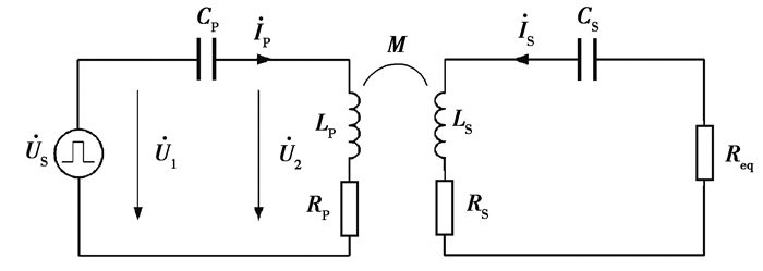 | $ \left\{ {\begin{array}{*{20}{l}} {{{\dot U}_{\rm{s}}} = {{\dot I}_{\rm{p}}}\left( {j\omega {L_{\rm{p}}} + \frac{1}{{j\omega {C_{\rm{p}}}}} + {R_{\rm{p}}} + \frac{{{\omega ^2}{M^2}}}{{{Z_{\rm{s}}}}}} \right);}\\ {0 = {{\dot I}_{\rm{s}}}\left( {j\omega {L_{\rm{s}}} + \frac{1}{{j\omega {C_{\rm{s}}}}} + {R_{\rm{s}}} + {R_{{\rm{eq}}}} + \frac{{{\omega ^2}{M^2}}}{{{Z_{\rm{p}}}}}} \right);} \end{array}} \right. $ | (6) |