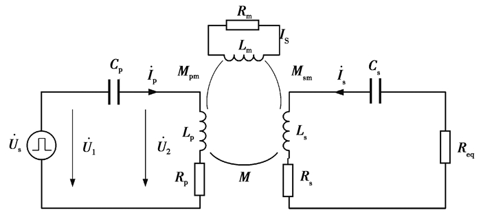 | $ \left\{ {\begin{array}{*{20}{l}} {{{\dot U}_{\rm{s}}} = {{\dot I}_{\rm{p}}}(j\omega {L_{\rm{p}}} + \frac{1}{{j\omega {C_{\rm{p}}}}} + {R_{\rm{p}}}) + j\omega M{{\dot I}_{\rm{s}}} + j\omega {M_{{\rm{pm}}}}{{\dot I}_{\rm{m}}};}\\ {0 = {{\dot I}_{\rm{s}}}(j\omega {L_{\rm{s}}} + \frac{1}{{j\omega {C_{\rm{s}}}}} + {R_{\rm{s}}} + {R_{{\rm{eq}}}}) + j\omega M{{\dot I}_{\rm{p}}} + j\omega {M_{{\rm{sm}}}}{{\dot I}_{\rm{m}}};}\\ {0 = {{\dot I}_{\rm{m}}}(j\omega {L_{\rm{m}}} + {R_{\rm{m}}}) + j\omega {M_{{\rm{pm}}}}{{\dot I}_{\rm{p}}} + j\omega {M_{{\rm{sm}}}}{{\dot I}_{\rm{s}}};}\\ {{Z_{\rm{m}}} = j\omega {L_{\rm{m}}} + {R_{\rm{m}}},} \end{array}} \right. $ | (13) |