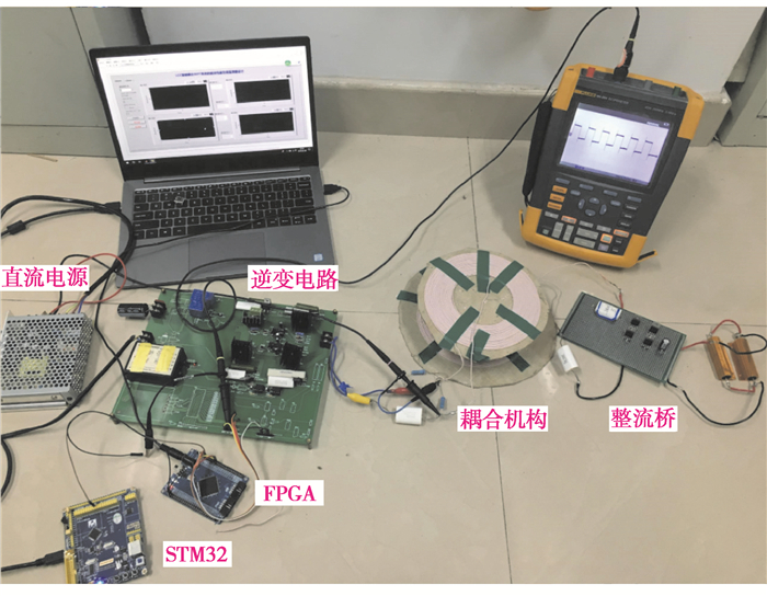 为进一步验证其可行性,根据图 1的系统拓扑和表 1的系统参数,研究搭建了具有非铁磁性金属异物检测功能的S/S型MC-WPT系统样机,如图 7所示。实验装置主要包含直流电源、逆变电路、FPGA最小系统板、STM32开发板、耦合机构、发射端/拾取端补偿电容、整流桥和负载功率电阻几部分。其中,FPGA控制频率合成模块产生高频方波信号,用以驱动逆变电路中的MOSFET IRPF460,STM32开发板用于系统中