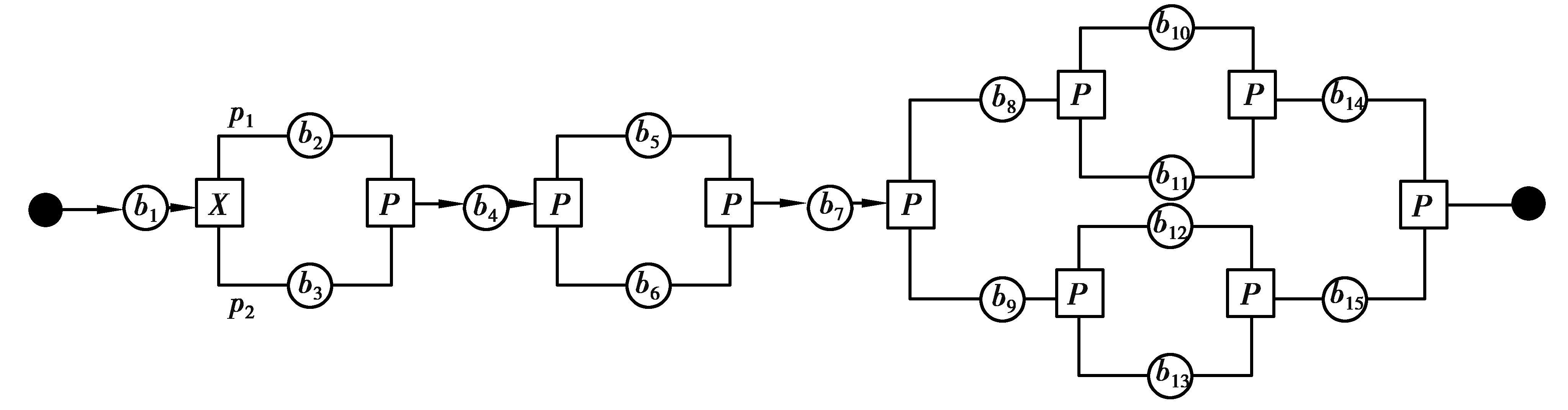 制造服务流程路径表示方法可有多种,这里参考文献[14]提供的业务流程串来表示。图 1的路径可表示为:b1.X(b2, b3).b4.P(b5, b6).b7.P((b8, P(b10, b11), b14), (b9, P(b12, b13), b15))。