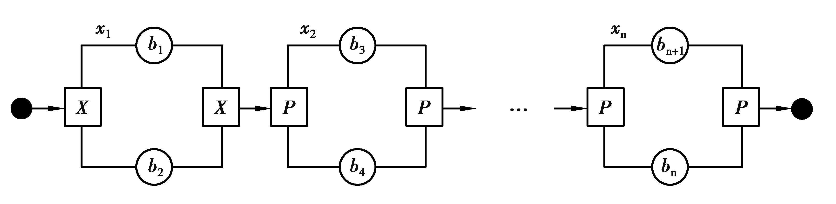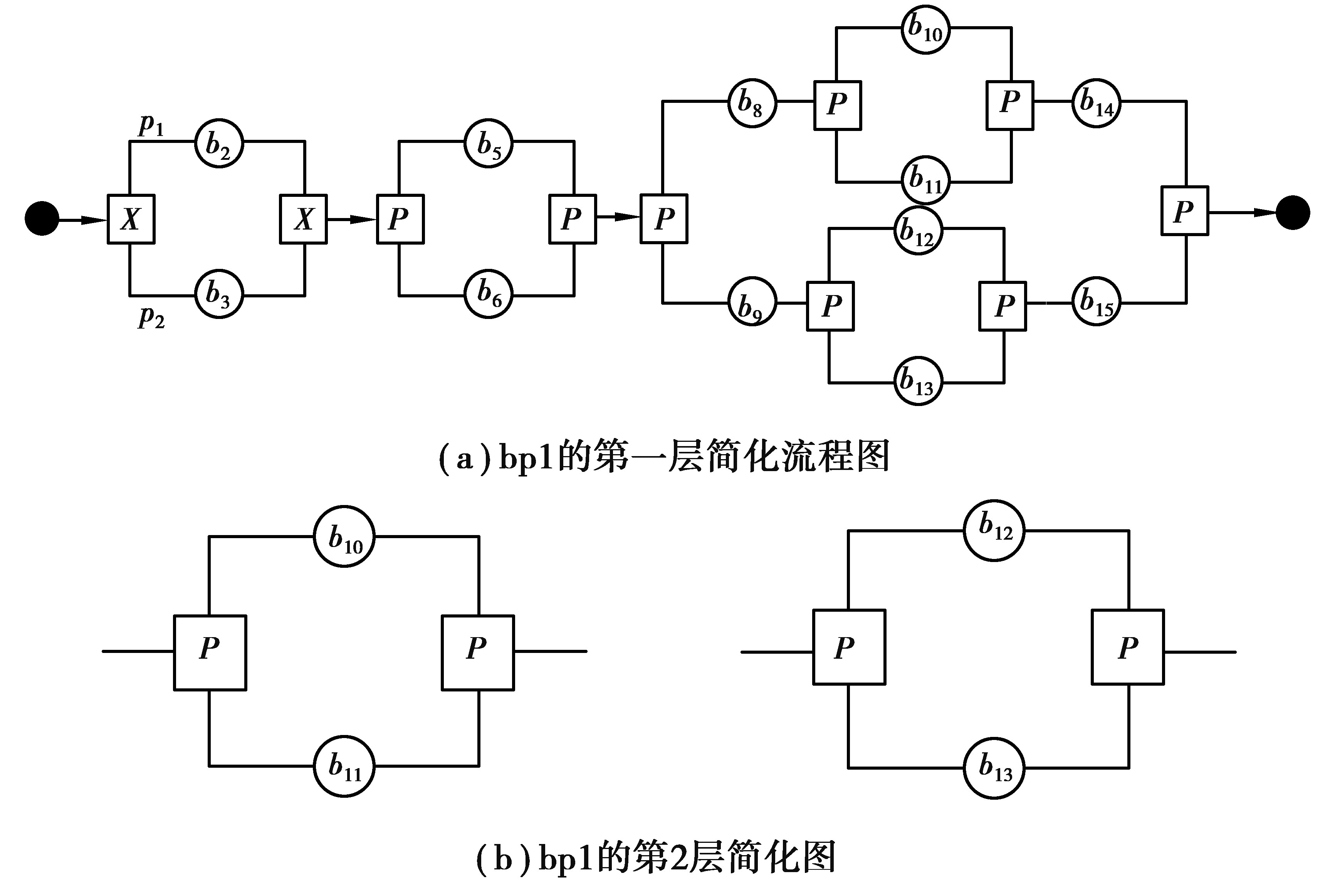 例如,对图 1的业务流程,不妨称之为bp1,其第一层简化后的路径如图 2(a),根据简化原则,可进一步对内层的图进行简化,结果如图 2(b)。第1层简化后变为3个分块,分别为X(b2, b3)、P(b5, b6)、P(b8.P(b10, b11),b9.P(b12, b13));第2层简化是对第1层的复合结构进一步简化,即对P(b8.P(b10, b11),b9.P(b12, b13))简化为P(b10, b11)、P(b12, b13)。