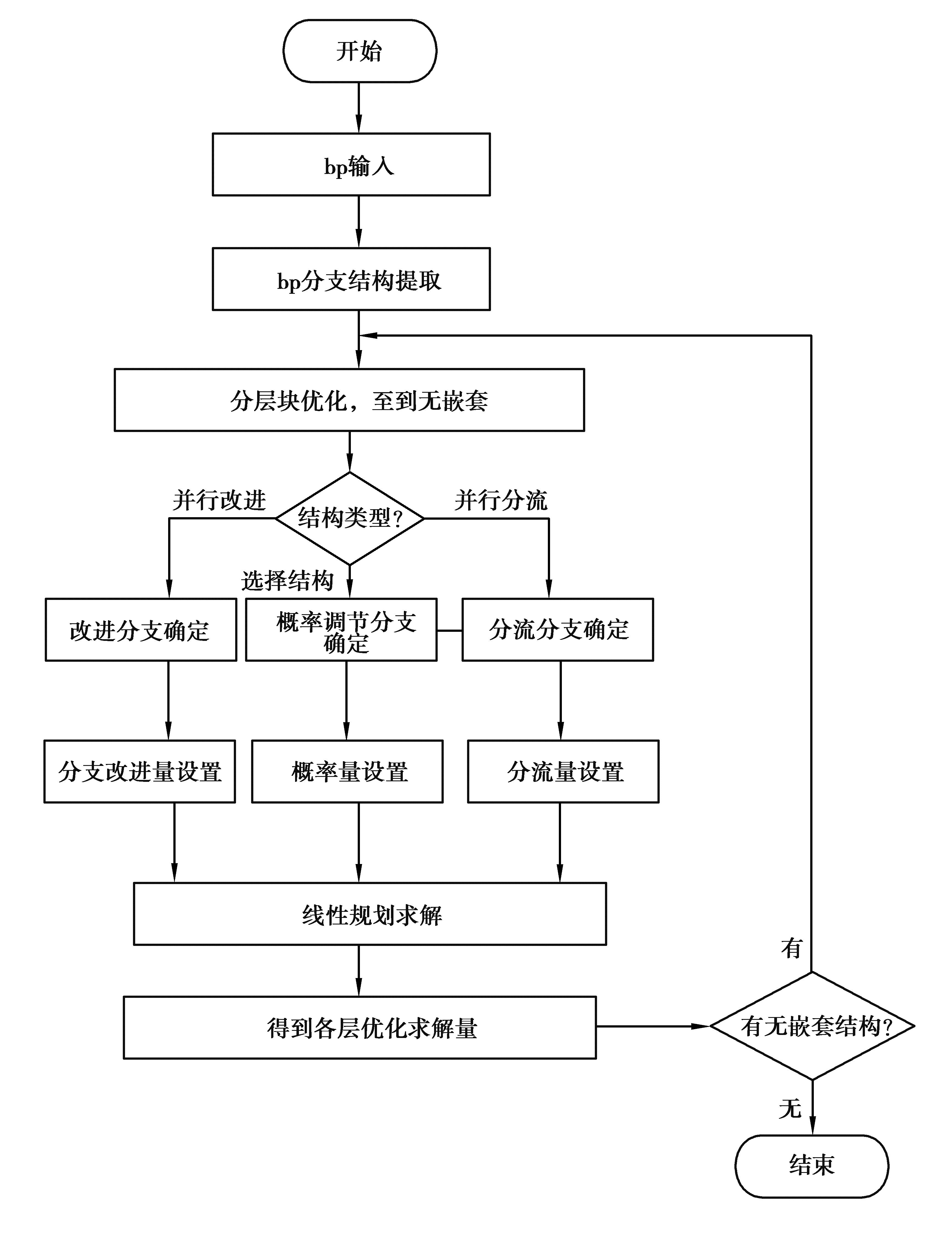其算法流程如图 4所示。算法首先对流程分支结构加以提取,然后进行分层分块优化计算,优化方法具体是对每层的分支结构进行线性规划求解。值得注意的是,对复合嵌套结构,采取先求外层的方法,确定外层的变量值后,然后以这些变量值为基础,对每个复合结构再进行上述同样的线性规划求解,可获得次层的各控制结构的优化配置变量值,以此类推,就可算出混合结构不同层次不同控制结构块的配置变量值。