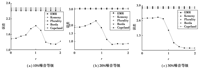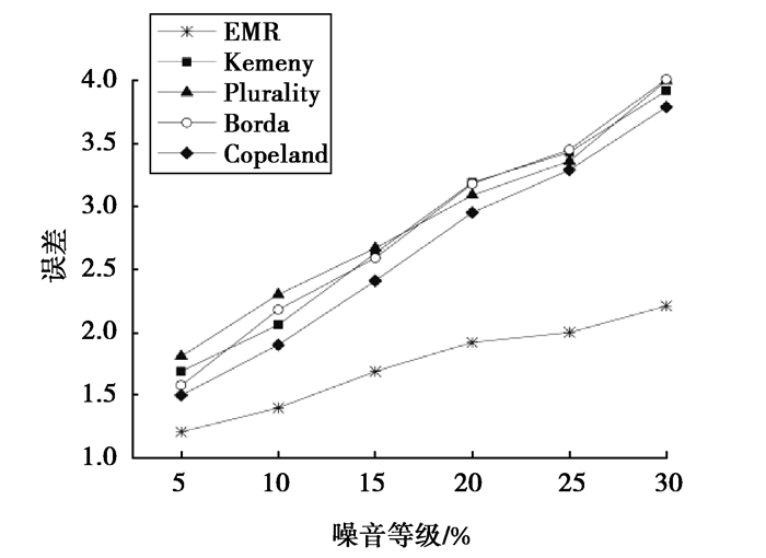 图 2表示在10%、20%、30%的带噪数据集下的实验结果。实验中Kemeny、Plurality、Borda,Copeland 4种对比方法的结果并不会随着误差上限t的取值不同而变化,图中结果与真相之间的误差是一条没有波动的横线。可以看出,在不同的噪音等级下,EMR方法的结果随着误差上限t取值的变化而变化。