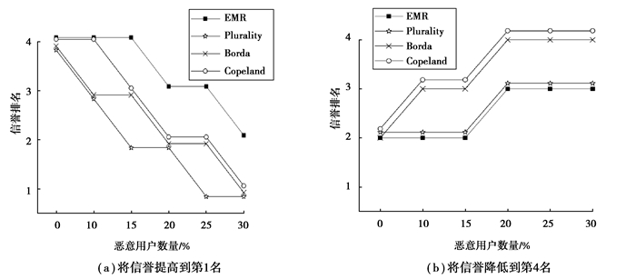 根据图 3(a)所示,随着恶意提高服务信誉的用户数量的增加,文中方法比Plurality、Borda、Copeland 3种对比方法得到的服务信誉排名提升得更慢。根据图 3(b)所示,随着恶意降低服务信誉的用户数量的增加,文中方法与Plurality方法得到的服务信誉排名一致,比Borda方法和Copeland方法得到的服务信誉排名降低得更慢,因此文中方法具有更好的抗操纵性。