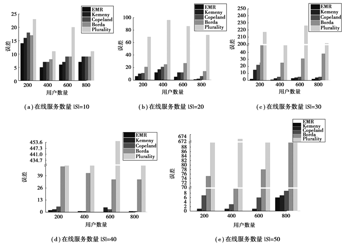 当r∈[0, 1),即对误差上限t的取值为用户对服务的偏好集合与真相之间的正确误差t*的过低估计时,EMR方法的结果与真相之间的误差呈上升趋势,在r=1附近时,EMR方法的结果与真相之间的误差达到了最大,但也比Kemeny、Plurality、Borda,Copeland这4种常见方法得到的结果与真相之间的误差小。当r∈(1, 2]的范围内,即对误差上限t的取值适当高估时,EMR方法结果与真相之间的误差可以达到最小。