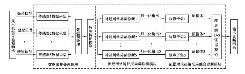 该模型具体步骤是, 首先挖掘蕴含在SCADA系统中有关风机齿轮箱轴承多种信号的故障特征, 然后将各信号的故障特征量作为神经网络输入, 将神经网络的输出进行归一化作为D-S证据理论的BPA值, 基于加权思想改进各证据, 最后利用组合规则将各条证据进行融合, 得出最终诊断结果。该诊断模型是将两种方法进行串联, 利用两种方法优势互补, 各子BP神经网络可以根据实际情况灵活处理参数, 大大增强了诊断模型的适应性, 同时该模型还具有一定的通用性。该研究的技术路线图如图 2所示。