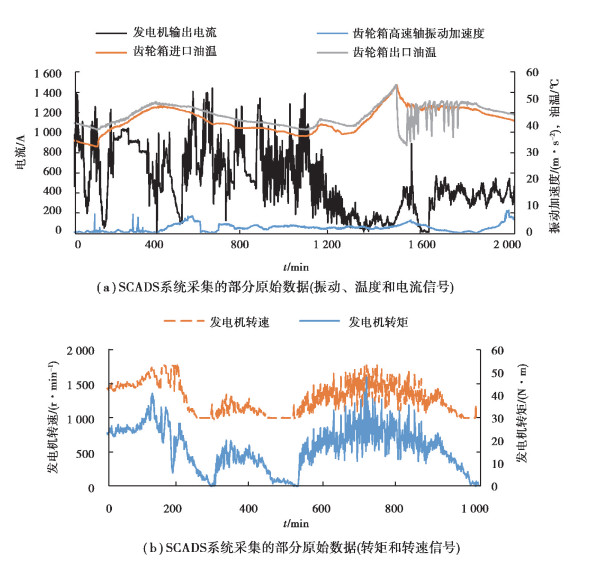 笔者以某风场2 MW风机运行的真实数据为例, 数据是风场SCADA系统采集的2017年3月7号~3月14号的数据。SCADA系统中有多种类型的数据, 其中振动信号、温度信号、电流信号、转矩信号和转速信号很具代表性, 能够很好地反映齿轮箱轴承的运行状态。振动信号是采用齿轮箱高速轴振动加速度(m/s2); 温度信号采用齿轮箱进出口油温差(℃), 由于温度为缓变信号, 输入数据取5 min的平均值; 电流信号采用发电机输出电流(A); 转矩信号采用发电机转矩(N· m); 转速信号采用发电机转速(r/min)。信号采集的具体情况如图 3所示。