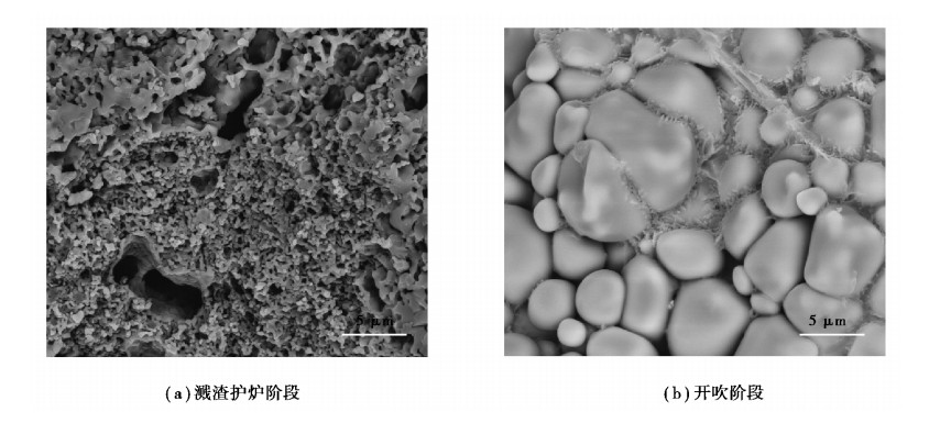 图 10 模拟炼钢不同阶段石灰石分解微观形貌 Fig. 10 Microstructure oflimestone decomposition in simulated different steel-making stage |