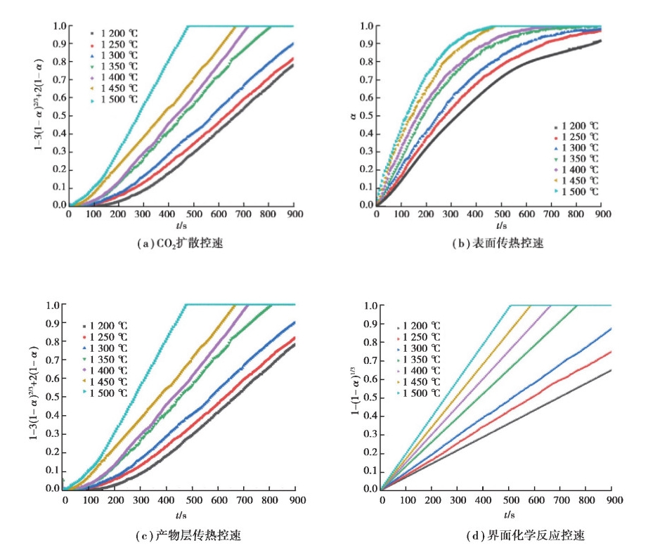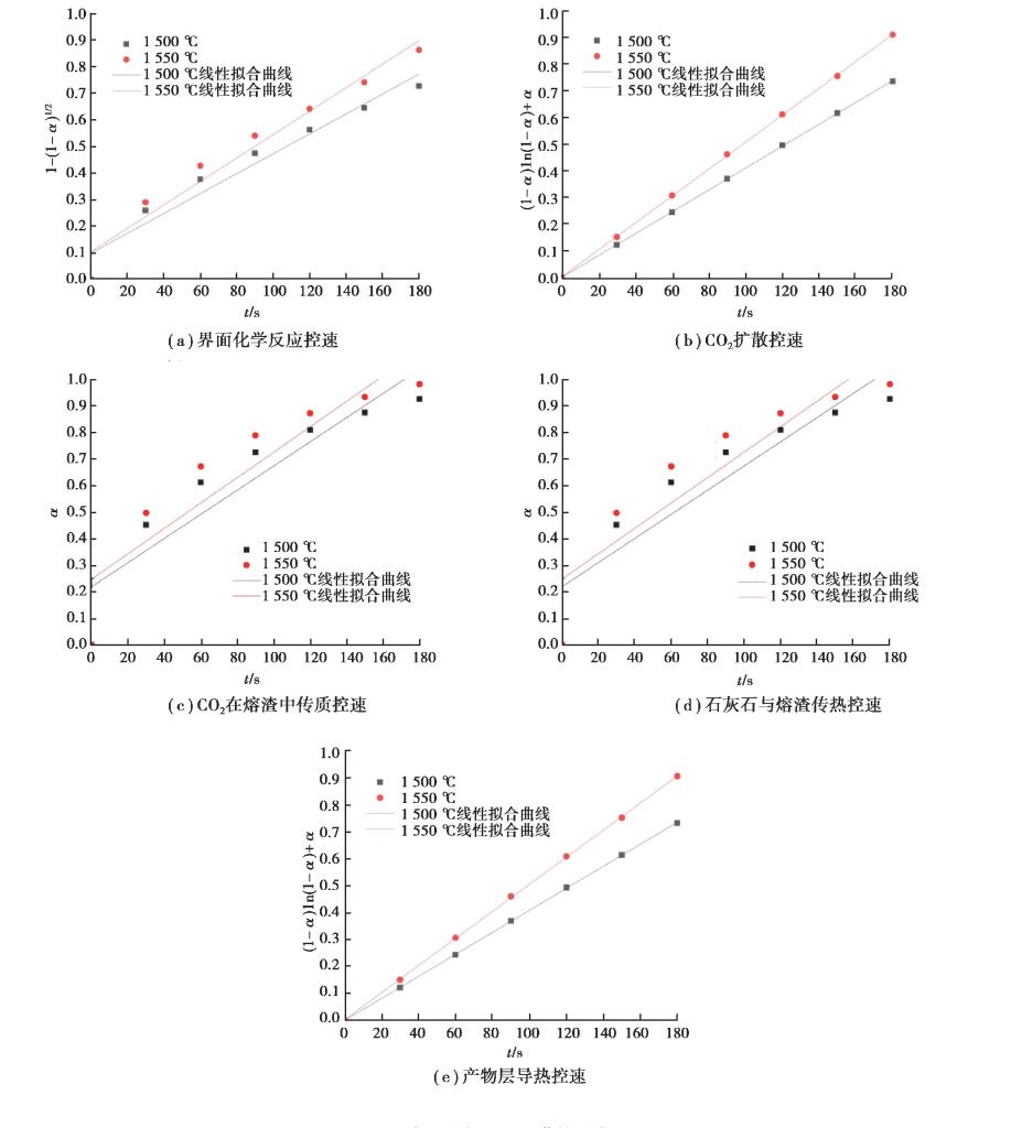3.2 模拟炼钢开吹阶段石灰石分解反应 3.2.1 开吹阶段石灰石分解限速环节确定统计分析实验结果, 使用2.3中的方法分别对石灰石传热与传质中5种不同控速环节进行拟合分析(见图 9和表 6), 结果表明产物层导热控速和CO2扩散控速时线性拟合度较高, 其相关系数值均达到0.999, 说明此种情况下石灰石在转炉渣中分解受产物层传热与CO2扩散共同控制。