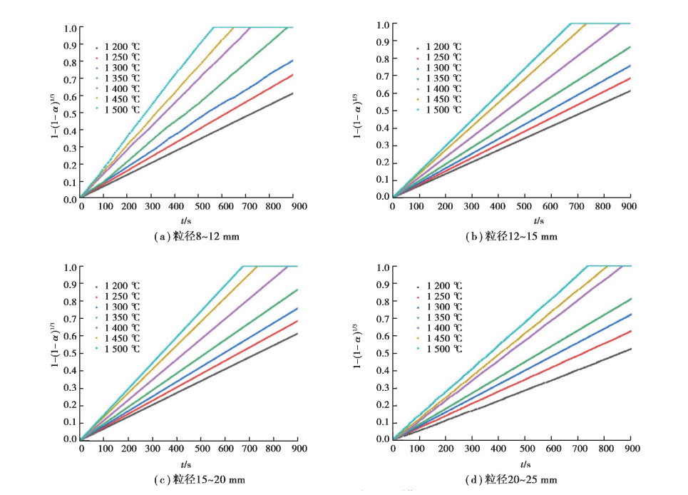 以4~8 mm粒径石灰石为例, 分别在CO2扩散、表面传热、产物层传热和界面化学反应控速4种情况下对其高温分解数据进行处理, 通过观察图 5曲线形状知界面化学反应控速情况下其影响因子1- (1-α )1/3和时间t具有较好的线性关系。进一步分析了8~25 mm粒径界面化学反应控速曲线(见图 6)发现均具有很好的线性关系。所以在此情况下, 界面化学反应为控速环节, 故可使用与界面反应相关的活化能来表征此种动力学模型。