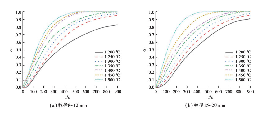 图 2(a)所示为模拟溅渣护炉时加入石灰石的分解反应。选取等量大颗粒石灰石(粒径4~8 mm、8~12 mm、12~15 mm、15~20 mm、20~25 mm), 装入与钼杆连接的钼丝网中, 在碳管炉内进行等温加热反应(1 200~1 500 ℃, 步长50 ℃)。钼杆上端连接电子天平和电脑, 记录存储实时质量。石灰石分解转率α可通过下式进行计算: