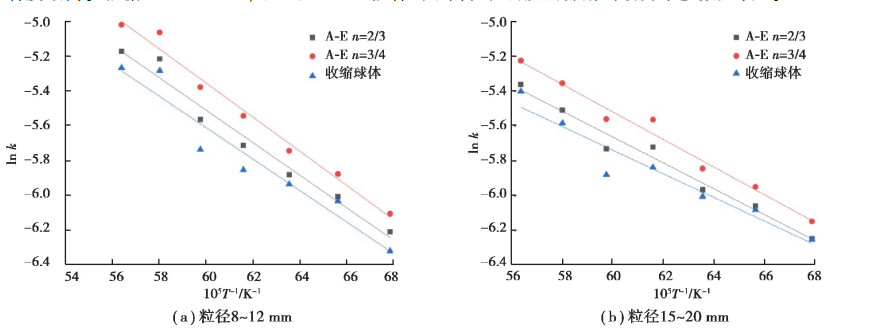 根据表 3、表 4分别作出不同粒径3种积分函数情况下lnk和1/T的关系图, 见图 8。选取线性条件最好的积分函数做最概然函数, 确定活化能E的大小及指前因子A 的值。图 8(a)与图 8(b)中可见A En =3/4的lnk和1/T线性拟合相关度最好。说明这种情况下石灰石分解反应符合随机成核和随后生长模型。经过统计分析4~25 mm性拟合度最高。根据lnk = -mE/(RT ) +ln A拟合出不同粒径石灰石分解的动力学参数见表 5。