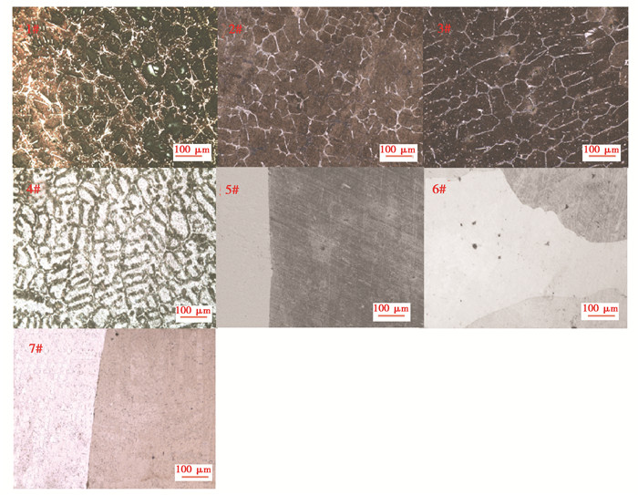 2 实验结果和分析 2.1 晶粒控制图 1为7种Fe-Al-Cr合金的金相组织, 1 #、2 #、3 #、4 #合金晶粒远小于5 #、6 #、7 #合金, 通过Image-Pro金相分析软件, 对7种合金晶粒的直径进行了统计, 如表 2所示。对于1#、2#和4#合金, 晶粒粒径通常小于100 μ m, 而3#合金晶粒的粒径略大于100 μm, 5#、6#和7#合金晶粒的粒径甚至达到毫米级。