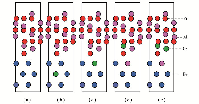 注:绿色球体代表Cr原子, 蓝色球体代表Fe原子, 紫色球体代表Al原子, 红色球体代表O原子。 (a) —Fe(110)/Al2O3 (0001)纯净界面; (b) —以Cr原子取代铁素体中Fe原子的界面结构; (c) —以Cr原子取代界面上Fe原子的界面结构; (d) —以Cr原子取代靠近界面的Al原子 的界面结构; (e) —两个Cr原子取代Al原子的界面结构。 图 10 计算用Cr在Fe(110)/Al2O3 (0001)界面的扩散模型 Fig. 10 Diffusion path of Crinthe Fe(110)/Al2O3 (0001) interface |