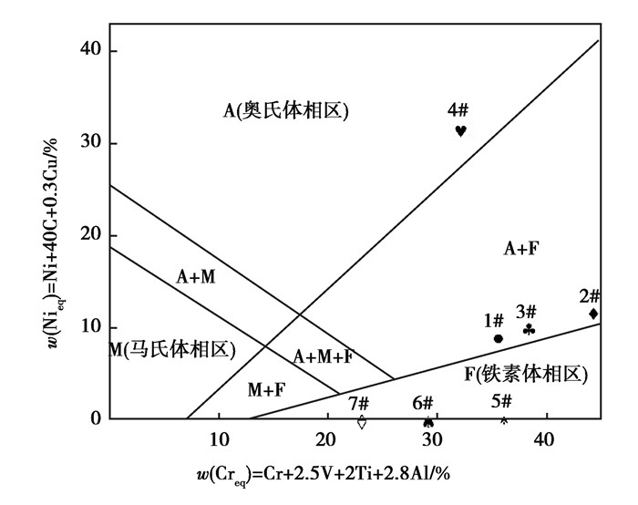 图 4 合金奥氏体化与Cr/Ni元素当量比的关系[1, 8] Fig. 4 The relationship between alloying austenitization and Cr/Ni element equivalent ratio[1, 8] |