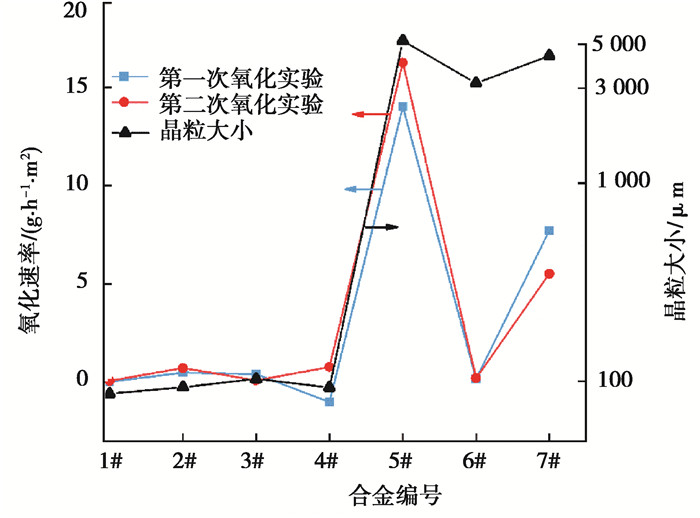 根据GB/T13303—199l, 1#合金在950 ℃时具有完全抗氧化性, 2#、3#合金和6#合金具有抗氧化性, 7#合金具有弱抗氧化性, 5#合金没有抗氧化性。4#合金为高碳钢, 由于高温下出现脱碳行为导致氧化后质量下降, 脱碳行为会破坏合金的抗氧化性。氧化速率与晶粒尺寸的关系如图 5所示, 从实验结果来看, 晶粒细小的合金在高温下具有更好的抗氧性。