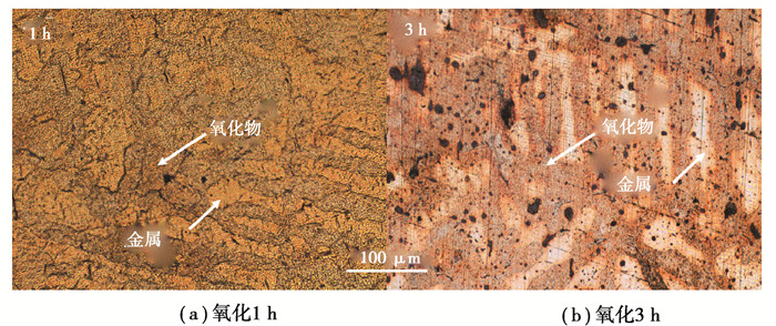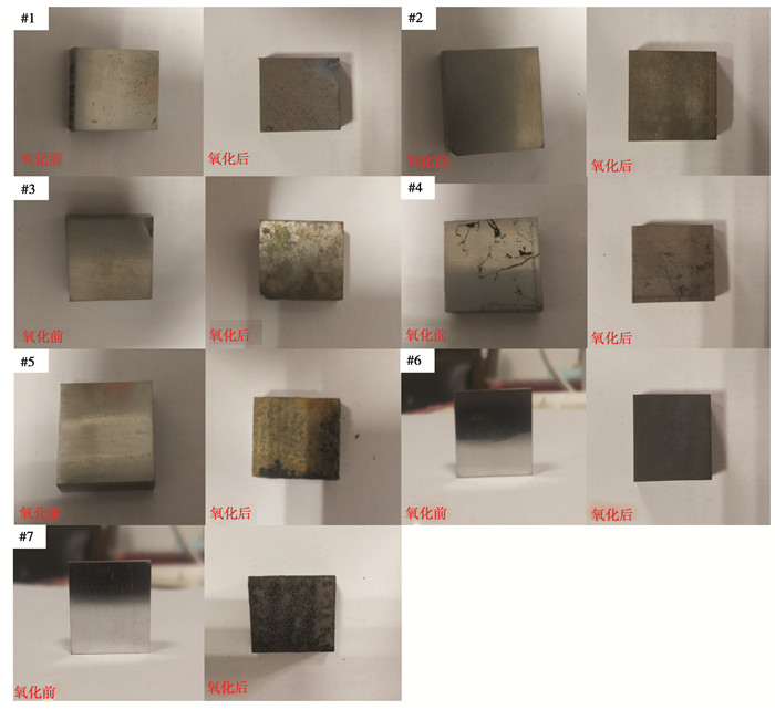 合金经线切割切成一个15 mm×15 mm×5 mm(±1 mm)的试样, 置于马弗炉中, 空气气氛, 炉内温度为950 ℃, 炉内压力为标准大气压。保温10h后, 关闭阀门, 将炉子冷却至室温进行称重。然后, 用砂纸去除氧化膜表面直至光滑, 再次放入相同条件的马弗炉中, 保温10 h, 然后冷却至室温称重, 通过X射线衍射和金相显微镜形貌观察对氧化产物进行分析。