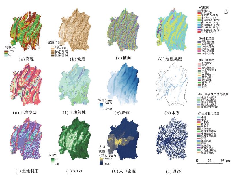 通常情况下, 地质条件和地表覆盖控制着一个地区表层土壤的性质以及深部岩土体的物理属性[18]。地震会造成大量的突发性滑坡, 由于研究区内地震烈度相同且较低, 且距离断裂带距离相差不明显, 因此地震烈度与断裂带这个因子没有被添加进数据库。较软弱的土壤会更易失稳, 而较强的土壤侵蚀则会加大这种失稳。植被在一定程度上会加强裸露地表的稳定性从而使表面稳定。