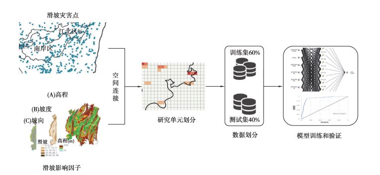 首先, 研究区被划分为500 m×500 m的正方形网格单元, 共计20 898个, 并计算落入网格内的滑坡点数作为神经网络模型中的目标值。与此同时, 通过空间连接分别导入滑坡影响因子数据库中各类因子对应网格的值作为预测变量。然后, 将数据集随机划分为60%的训练集和40%的测试集。最后, 将数据集导入模型, 最终模型输出各变量的重要性以及模型准确性。