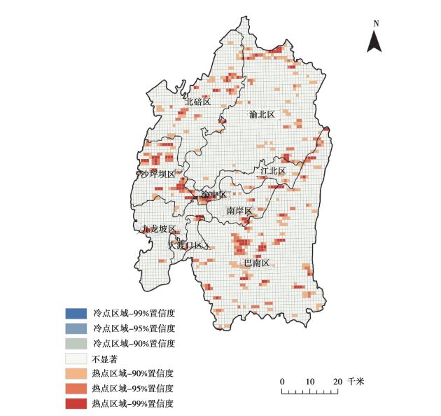 热点探测结果中, 99%置信度热点区域主要集中于渝中区、沙坪坝区和巴南区北部。表明上述地区中存在连续的多个发生灾害次数较多的单元, 即遭受灾害最为严重的区域。
