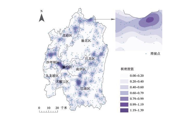 核密度估计结果最大值出现在最为核心的渝中区, 核密度值达到了1.3以上, 表明该地区滑坡分布最为密集; 沙坪坝区和巴南区出现了数个聚集区域, 并呈现出不规则的分布; 北碚区和渝北区的滑坡分布主要沿东北西南走向的终南山分布, 同时渝北区的大部分地区滑坡分布较少。大渡口区、九龙坡区、南岸区和江北区大部分地区均属于滑坡密度较小的区域。