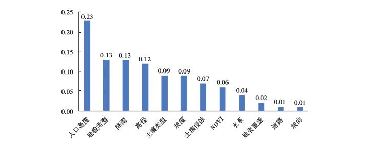图 6 滑坡影响因子权重贡献值(归一化后结果) Fig. 6 Landslide influencing factor weight contribution value (results after normalization) |