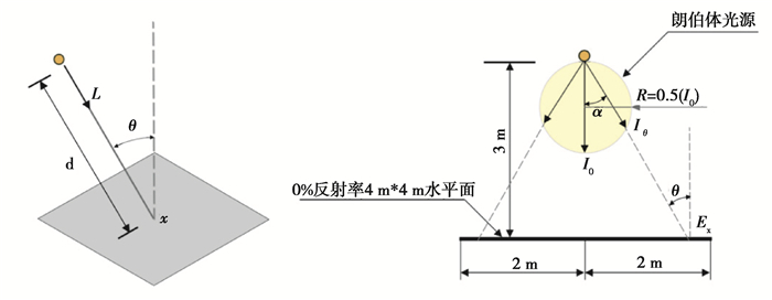 式中:E为计算点X的直接照度,lx;Iθ为点光源在计算点X方向上的发光强度,cd;θ为光源光线相对于接收平面法线(计算点X)的入射角,rad;d为点光源和计算点X之间的距离,m。