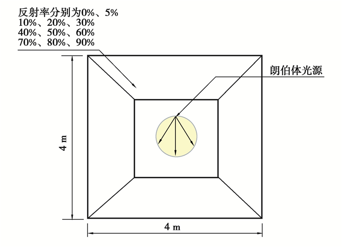 用于评估软件“模拟光源照射在封闭房间时,经过多次反射后,房间内不同反射率表面的平均间接照度”的计算精度。模拟场景如图 10所示,房间尺寸为4 m×4 m×4 m,各内表面具有均匀漫射和光谱中性的特点。光源为朗伯体点光源,位于房间的中心,光通量Φ为10 000 lm;为分析不同反射率的影响(各内表面的反射率ρ相同),模拟反射率从5%变化至95%。CIE 171:2006通过式(7)计算分析得出近似值