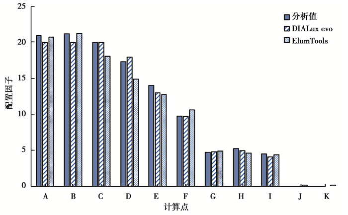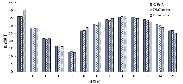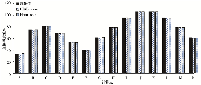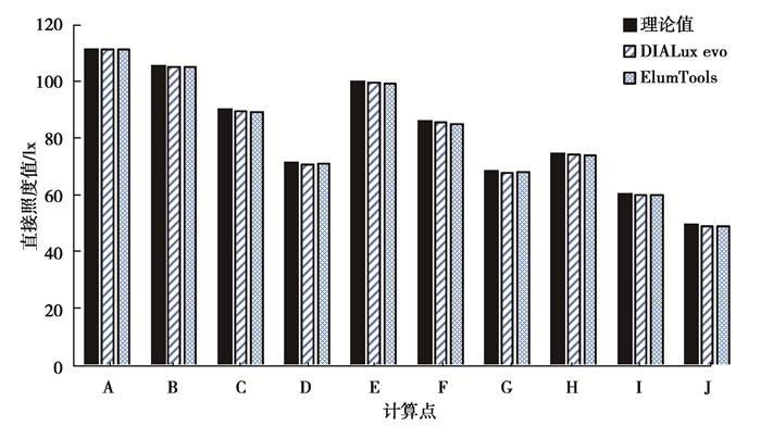 模拟结果如图 12、表 2所示。2款软件绝大部分计算值与CIE理论值相对误差极小:DIALux evo相对误差在-1.19%~1.29%的范围内,ElumTools最大相对误差为4.04%,其余点的相对误差在-0.54%~1.19%的范围内,4.04%的误差出现在邻近光源的A点,配置因子较小,是计算间接照度时存在缺陷的主要原因[21]。