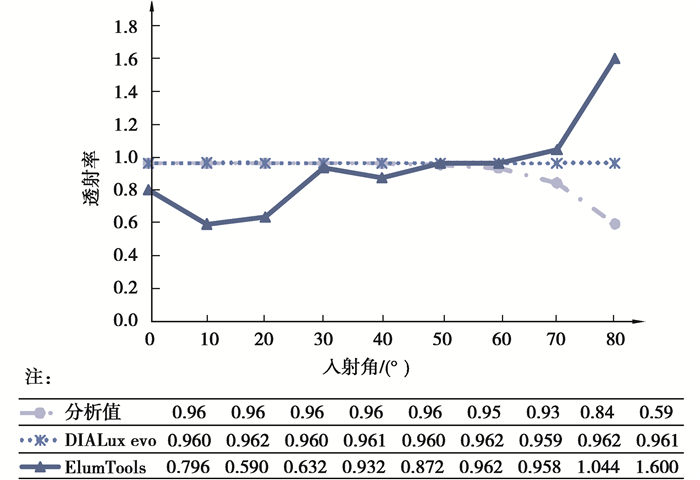 2.4 测试用例5.5模拟计算结果如图 13所示。DIALux evo模拟所得透射率始终在0.960~0.962之间,这是由于其假设透射率不随光束入射角发生变化[21]。ElumTools模拟所得透射率在0.59~1.60之间,光束入射角为10°、20°和80°时的误差较大,30°~70°之间的误差相对较小。综上所述,2款软件在涉及玻璃定向透射时,均为低计算精度。