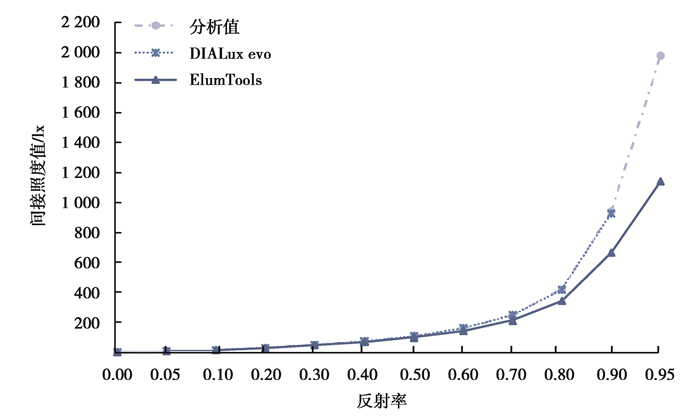 模拟计算结果如图 17和表 6所示。DIALux evo在反射率为0.90时相对误差最大,为-1.29%;ElumTools相对误差为-7.70%~-42.33%,尤其反射率在0.8以上时误差较大。ElumTools反射率最低可设置值为1%,而测试用例5.8是以反射率为0%作为基准情况进行计算,导致相对误差较大。