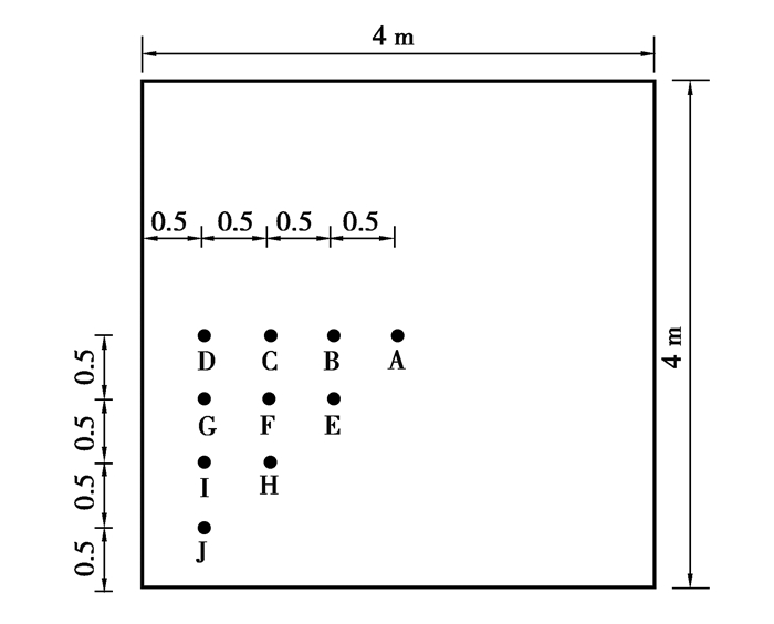 1.1 测试用例5.2:点光源直接照度计算精度用于评估软件“使用点光源时,水平面上的点接收的直接照度”的计算精度。模拟场景如图 1所示:水平面的尺寸为4 m×4 m,表面反射率为0%,中心点位于点光源正下方3 m处;点光源为朗伯体,垂直方向上的最大发光强度为1 000 cd。水平面上有10个计算点,编号为A~J,如图 2所示。CIE 171:2006理论值通过式(1)计算