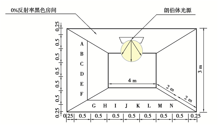 1.2 测试用例5.3:面光源直接照度计算精度用于评估软件“使用面光源时,房间内表面上的点接收的直接照度”的计算精度。模拟场景和计算点位置,如图 3所示:房间的尺寸为4 m×4 m×3 m,内表面反射率为0%;面光源为朗伯体,位于天花板中心,尺寸为1 m×1 m,垂直方向上的最大发光强度为1 000 cd;房间内表面上共有14个计算点,编号为A~N。CIE 171:2006理论值通过式(2)计算
