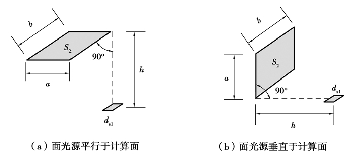 式中:E为计算点的直接照度,lx;M为面光源的发光强度,lm/m2;F12为计算面面积dS1与面光源面积S2之间的配置因子;其中,当面光源平行于计算面时,如图 4(a)所示,配置因子F12, H通过式(3)计算;当面光源垂直于计算面时,如图 4(b)所示,配置因子F12, V通过式(4)计算。