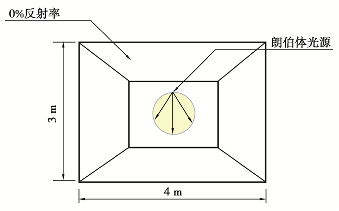 1.3 测试用例5.4:光通量守恒性能用于评估软件“保持光通量守恒”的能力(理论上,封闭房间内光源输出的光通量与各表面接收的总光通量相等)。封闭房间的尺寸为4 m×4 m×3 m,内表面反射率为0%;CIE 171:2006中指出,光源可任意选择[18];实验采用朗伯体点光源,光通量Φo为3 142 lm,位于房间中心;通过计算房间内各表面的平均照度,进而计算房间内总的光通量Φi,模拟场景如图 5所示。CIE 171:2006分析值通过式(5)计算