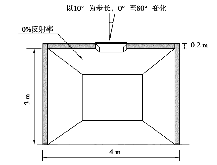 1.4 测试用例5.5:定向透射性能用于评估软件“计算房间内光源光线定向透射玻璃”的能力。模拟场景如图 6所示:房间的尺寸为4 m×4 m×3 m,内表面反射率为0%;屋顶中心开1 m×1 m的采光口,采光口深为200 mm,采光口的玻璃,透射率为96%;光源为点光源,光线为1组窄配光的平行光;光束瞄准采光口中心,入射角θ以10°为步长,由0°~80°变化。在有、无玻璃2种情况下,可通过式(5)分别计算室内总光通量Φi,进而通过式(6)计算定向透射率τθ。CIE 171:2006分析值通过式(6)计算