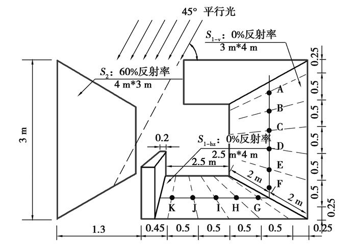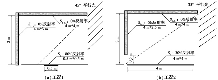 工况2:光源为面光源,光线为1组窄配光的平行光,光束与水平方向夹角为35°;漫反射面S2尺寸为4 m×4 m,反射率为30%,位于天花板下方;垂直计算面S1-V尺寸为4 m×2.5 m,表面反射率为0%,距离S2中心点2 m;水平接收面S1-hz尺寸为4 m×4 m,表面反射率为0%,位于地面以上3 m处,朝向S2,与S1-V相邻,模拟场景如图 7(b)所示。