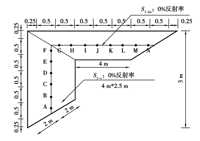 S1-v和S1-hz不接收直接照度并且不反射光通量,但接收从漫反射面S2反射的一部分光通量。分别计算2种工况下,计算点接收的1次反射间接照度Ei,其在水平和垂直计算面上,共有14个,编号为A~N,具体位置如图 8所示,CIE 171:2006分析值通过式(7)计算