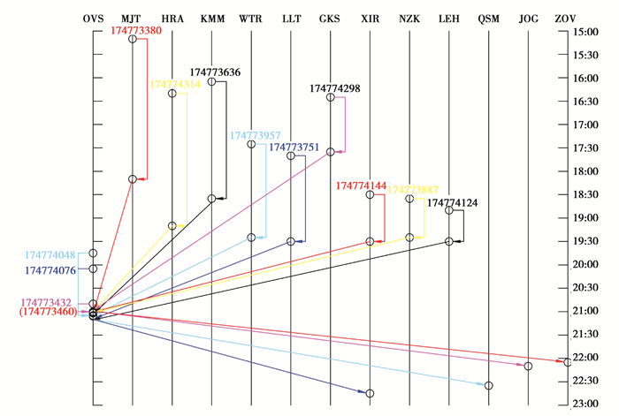 4.3 结果分析将航班数据带入本文建立的最小延误时间模型,并采用Floyd-Warshall算法进行求解,利用Matlab软件计算可得航班的调整方案。经统计,在OVS机场关闭时间段内,机型9共有13次航班计划需要进行调整,具体调整计划见表 1,图 3为本次航班调度的时空网络图。