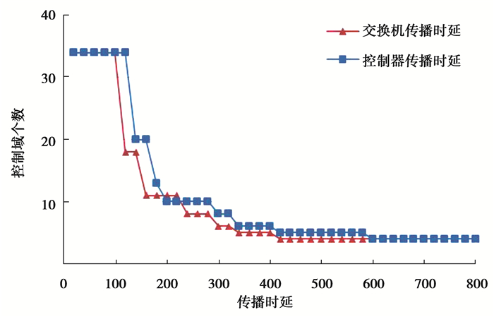 交换机与控制器传播时延上限σ,控制器与控制器的传播时延上限δ影响控制域划分个数。图 3中得知σ、δ值小于240时,控制域个数较多;随着时延上限增大,单个控制域中交换机个数增加,控制域个数减少。当σ大于400,δ大于等于600时,控制域个数不变化。