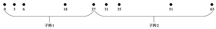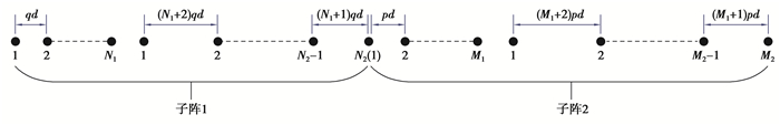1 互素嵌套阵列结构如图 1所示,互素嵌套阵列由2个子嵌套阵组成, 每个子阵可看成嵌套阵列[14]的扩展结构。令d=λ/2,其中λ表示信号波长,第一个子阵包含N (N=N1+N2)个阵元,单位间距为qd。第二个子阵包含M (M=M1+M2)个阵元,单位间距为pd,其中q与p是一对互素的正整数。图 2给出了一个9元互素嵌套阵列结构,其中q=3,p=4。
