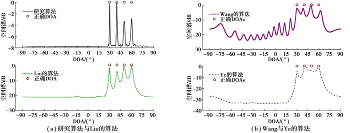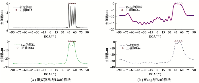 第一组仿真实验对比4种不同算法对角度的分辨能力,将快拍数固定在500,信噪比SNR(signal noise ratio)固定在10 dB。首先设4个信号的方向角为30°,40°,50°,60°。图 3(a)显示了算法与Liu等[10]提出的算法的空间谱。图 3(b)显示的是Wang等[8]和Ye[9]等所提算法的空间谱。通过观察这2幅对比图,可以发现只有算法和Liu的算法[10]能较好的将4个信号区分开,而其他2个算法对这4个信号的区分效果很差。然后将4个信号的方向角改为45°,50°,55°,60°,角度间隔减小到5°。图 4(a)显示出算法与Liu的算法[10]的空间谱,图 4(b)显示了Wang的算法[8]和Ye的算法[9]的空间谱。此时,可以发现算法依然能够将4个信号顺利的区分开,但其它3个算法都已无法区分这4个信号。这几幅仿真图中的结果可以反映出所提方法对信号的分辨能力要明显好过其它3种算法。